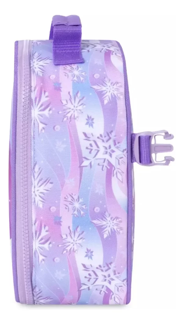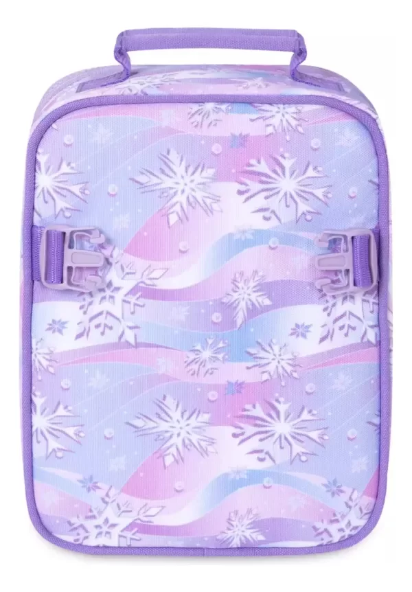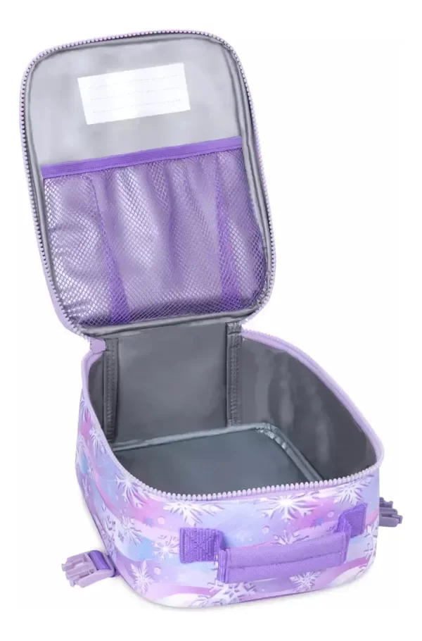 La reina helada de Arendelle es la compañera perfecta para la hora del almuerzo porque siempre mantendrá las cosas frescas y agradables. Elsa está acompañada por su hermana real Anna en este estuche con cierre térmico y copos de nieve holográficos. Magia en los detalles El arte de pantalla presenta a Elsa, Anna y Olaf. Copos de nieve holográficos con detalles bordados. Forro aislante Bolsillo interior de malla Compartimento abierto para acomodar diferentes tamaños de contenedores Cierre de cremallera con tirador adaptable. Área de etiqueta "Pertenece a" impresa en el interior Asa de transporte superior Parte de la colección Frozen Back to School Las necesidades básicas Poliéster reciclado (incluye correas, forro y cincha)