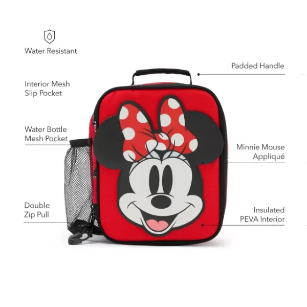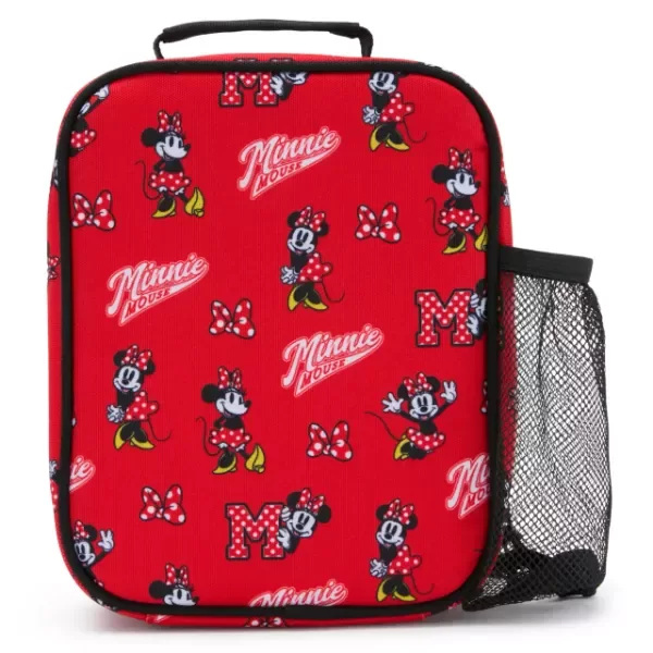 Esta lonchera universitaria de Minnie Mouse destaca por su estilo avanzado para la vuelta al cole, con un aplique de Minnie sonriente en la parte delantera. El estampado rojo brillante de los laterales muestra a Minnie en varias poses, además de la letra "M" de lunares estilo universitario y banderines de Minnie Mouse.